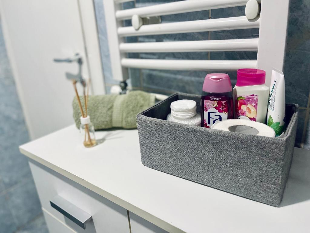 kada, fen za kosu, peškiri, toalet papir, šampon, sapun za telo